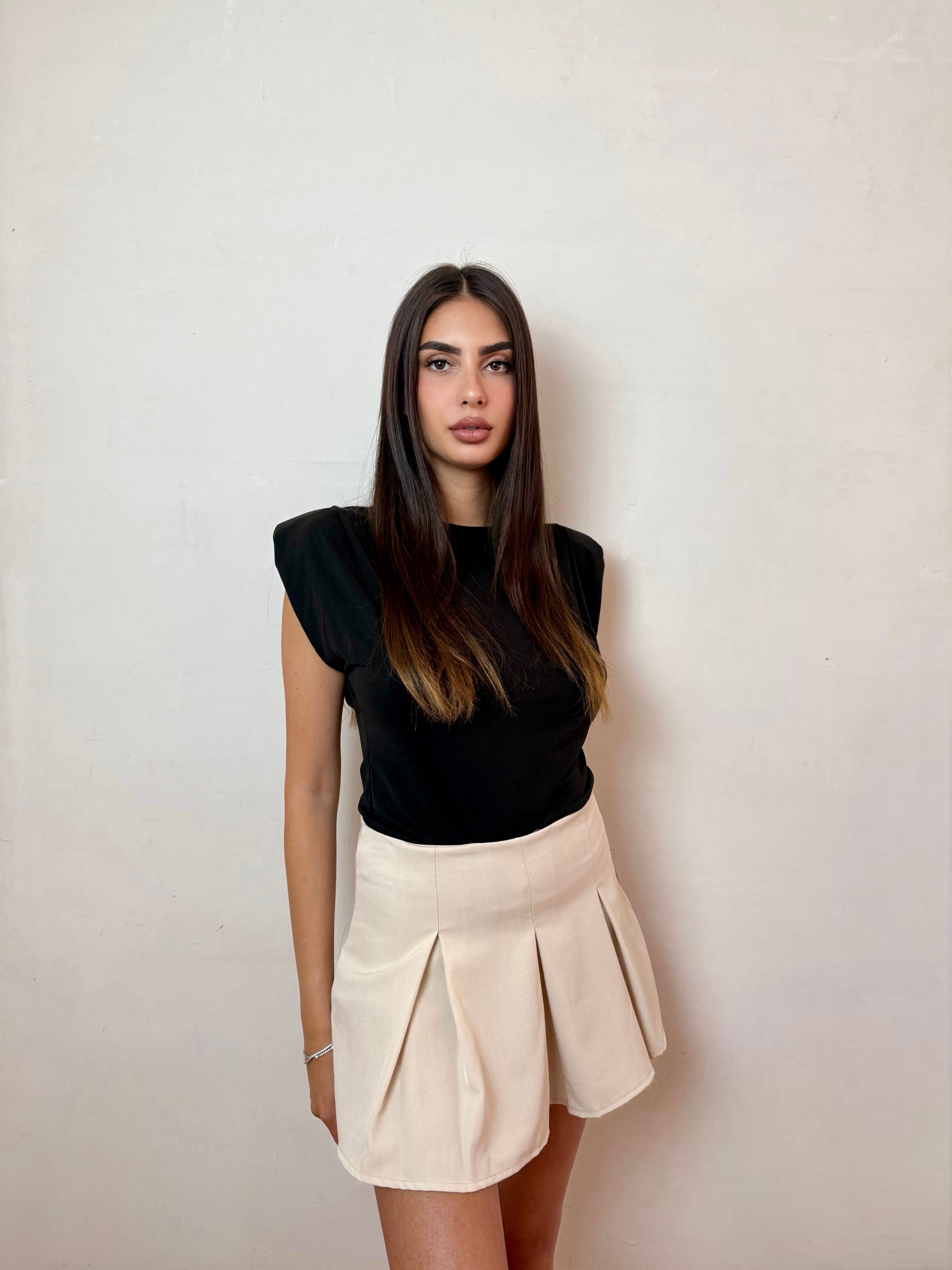 La t-shirt ha un design moderno e sofisticato, realizzata in un tessuto nero morbido. Le spalline ampie conferiscono un tocco strutturato e alla moda, mentre il taglio aderente esalta la silhouette. È un capo versatile, perfetto per abbinamenti sia casual che più eleganti.