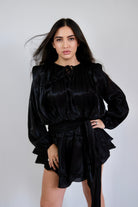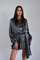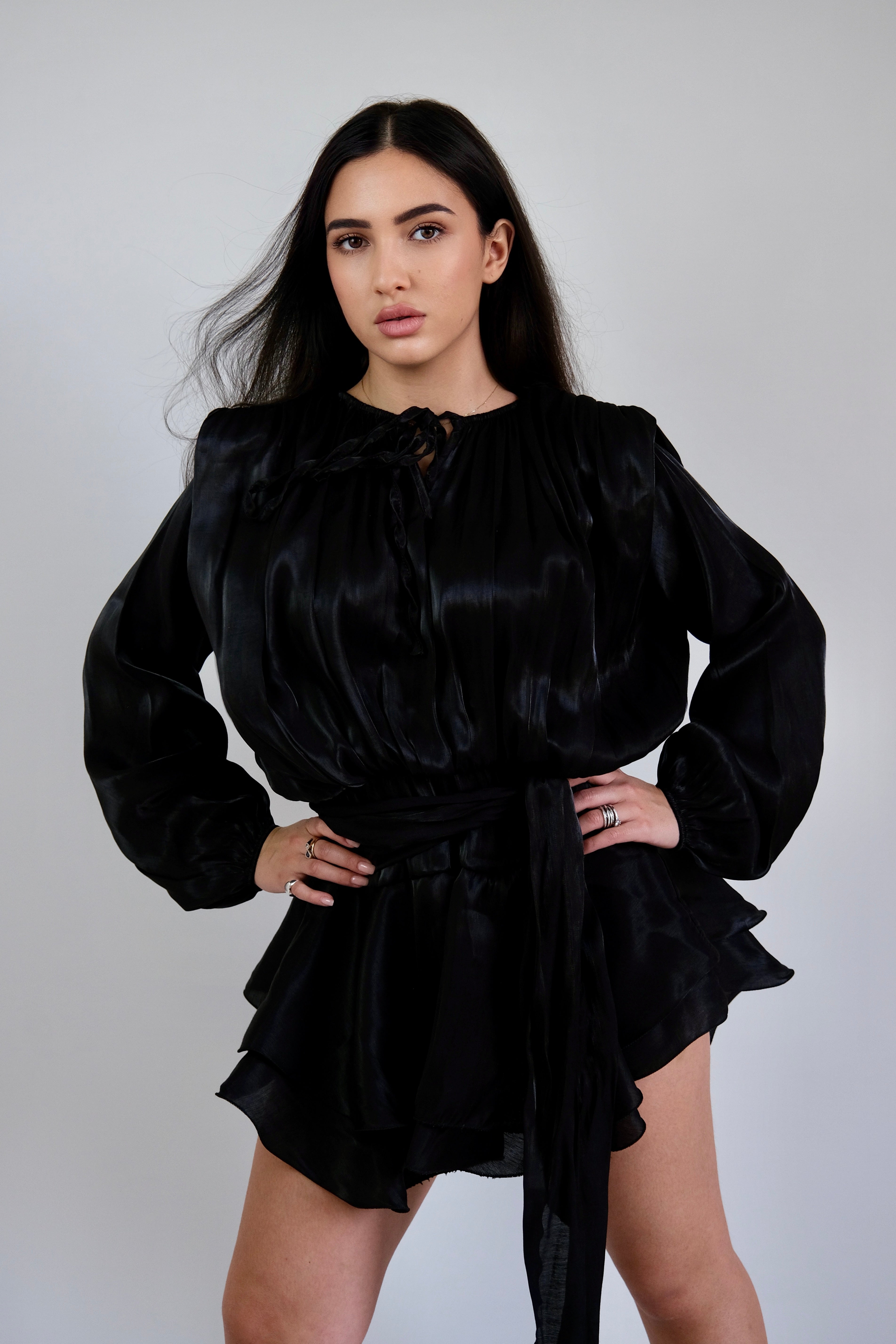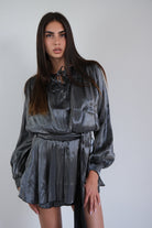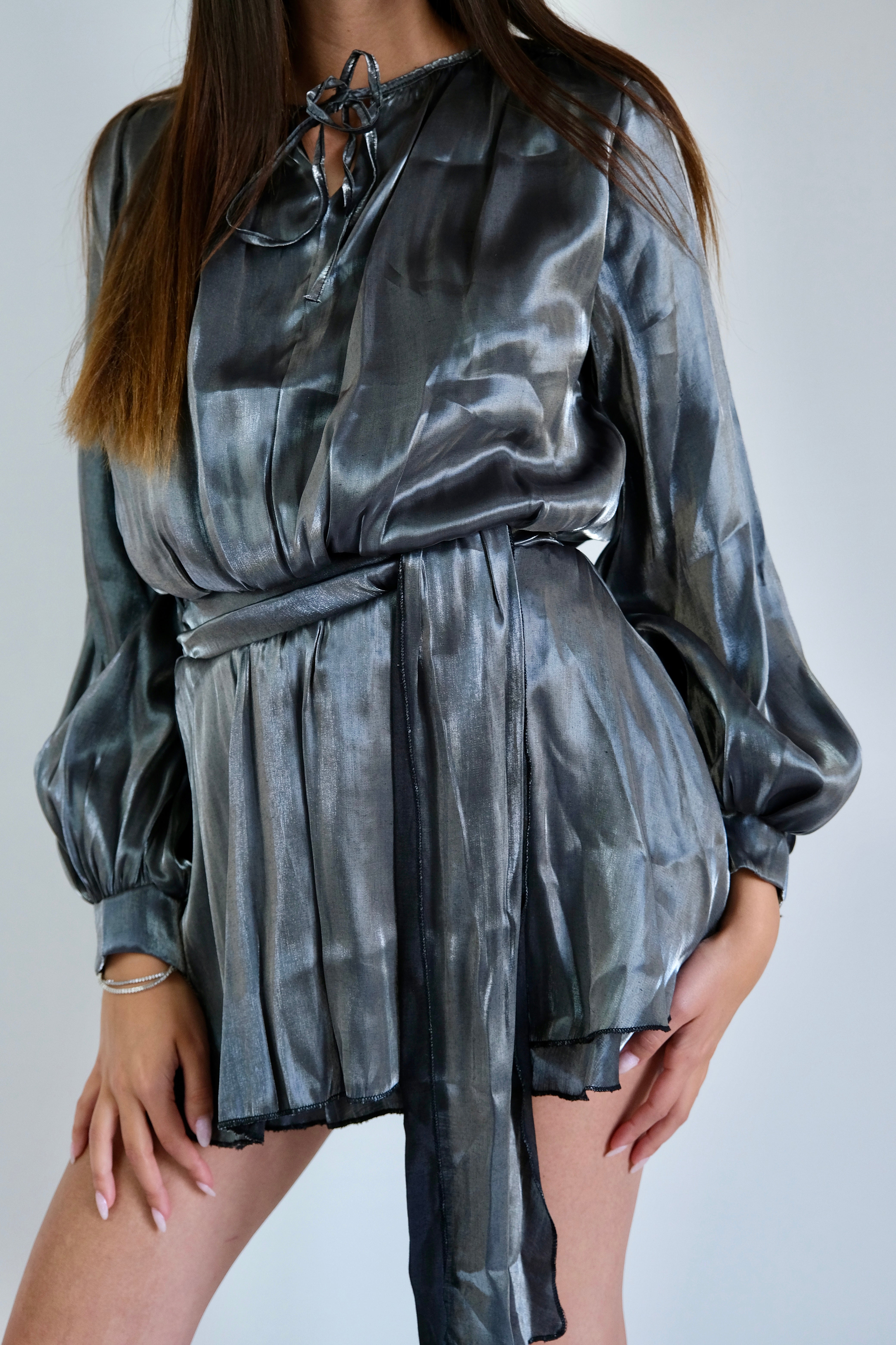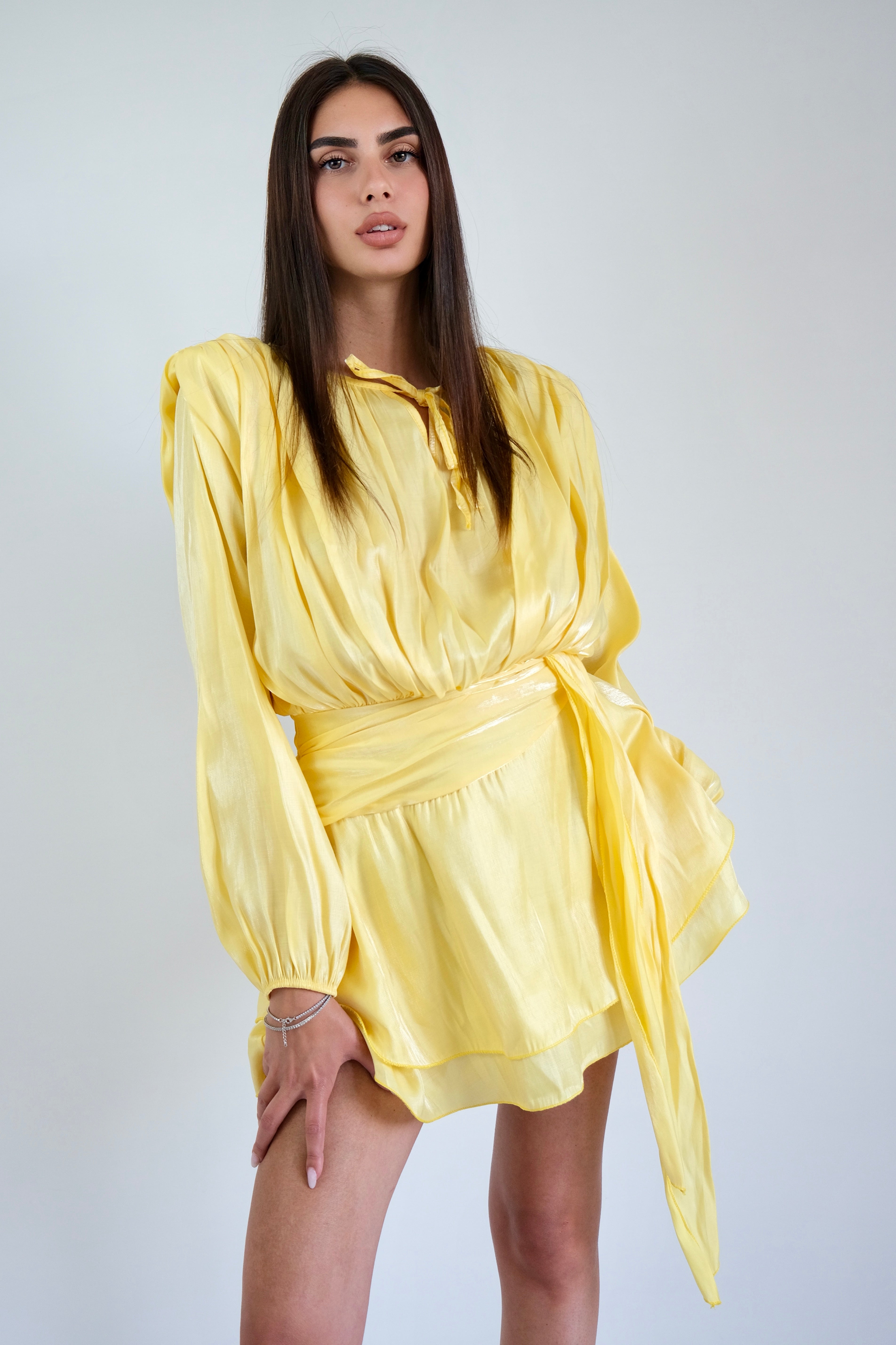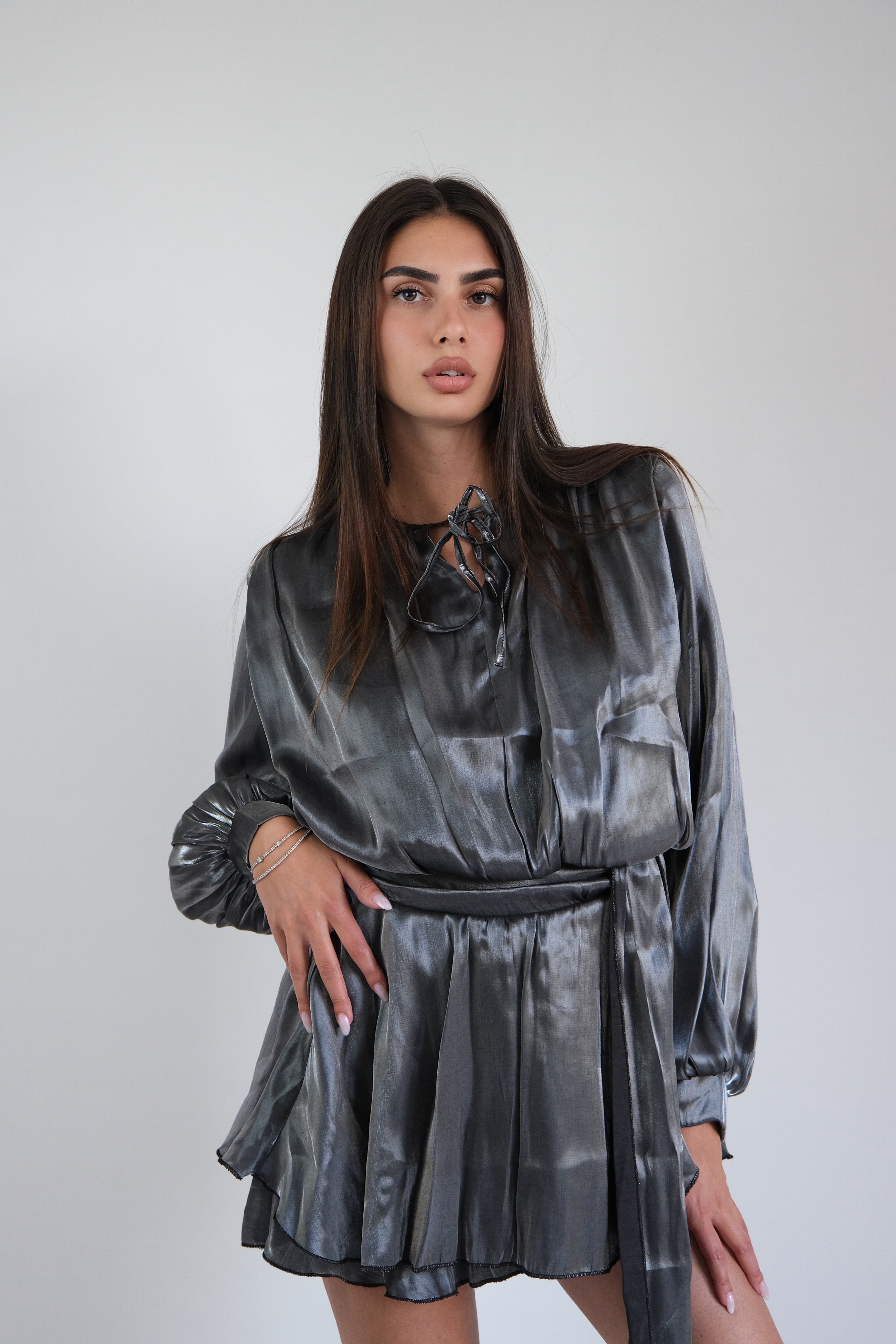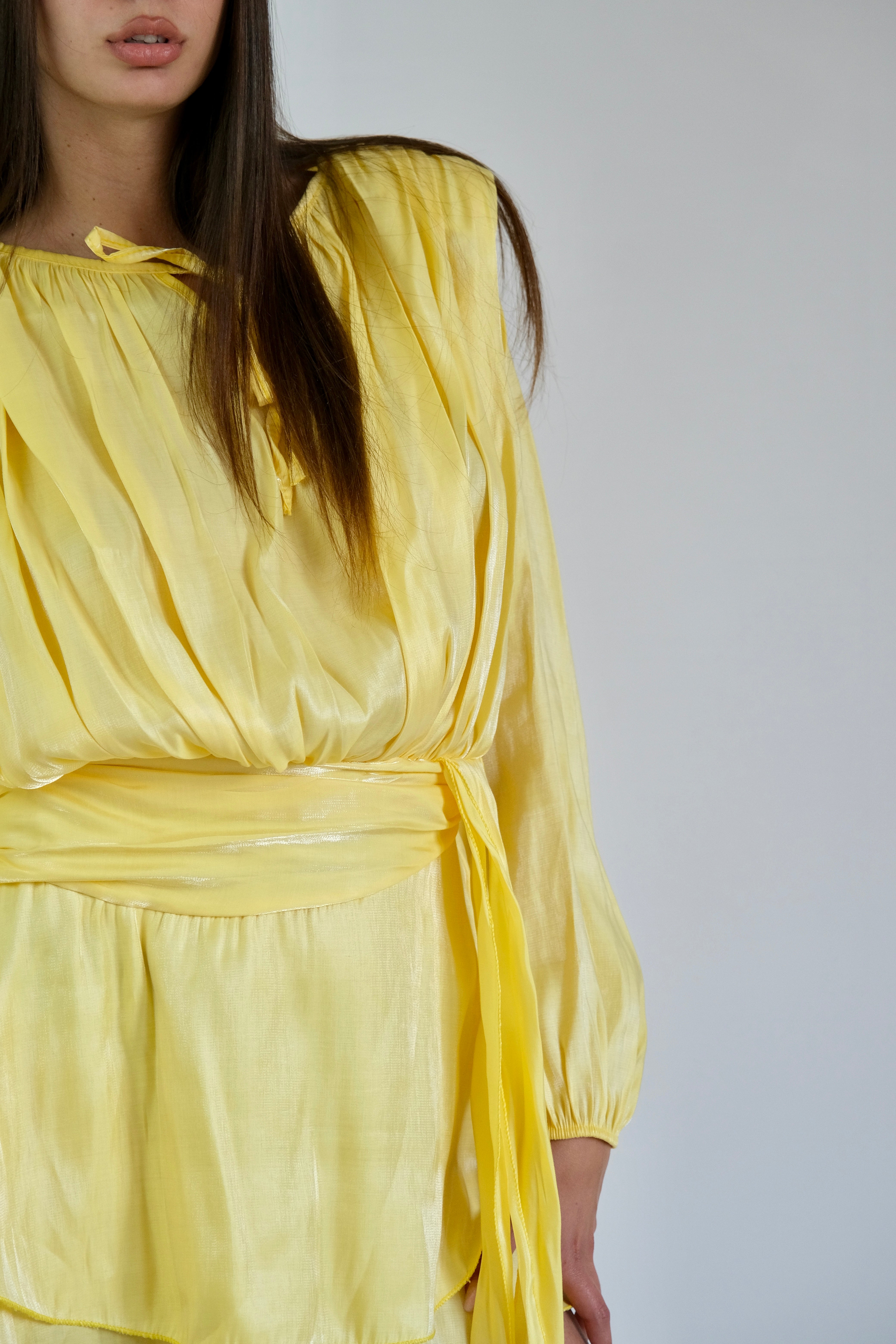 La parte superiore del abito presenta maniche lunghe e ampie, con una leggera arricciatura che aggiunge volume e movimento. La cintura in tessuto abbinato enfatizza la vita, creando una silhouette slanciata e femminile. Il tessuto leggero e fluido, conferisce all'abito un'atmosfera romantica e sognante. Questo abito è ideale per eventi primaverili o estivi, perfetto per chi cerca un look elegante e raffinato.