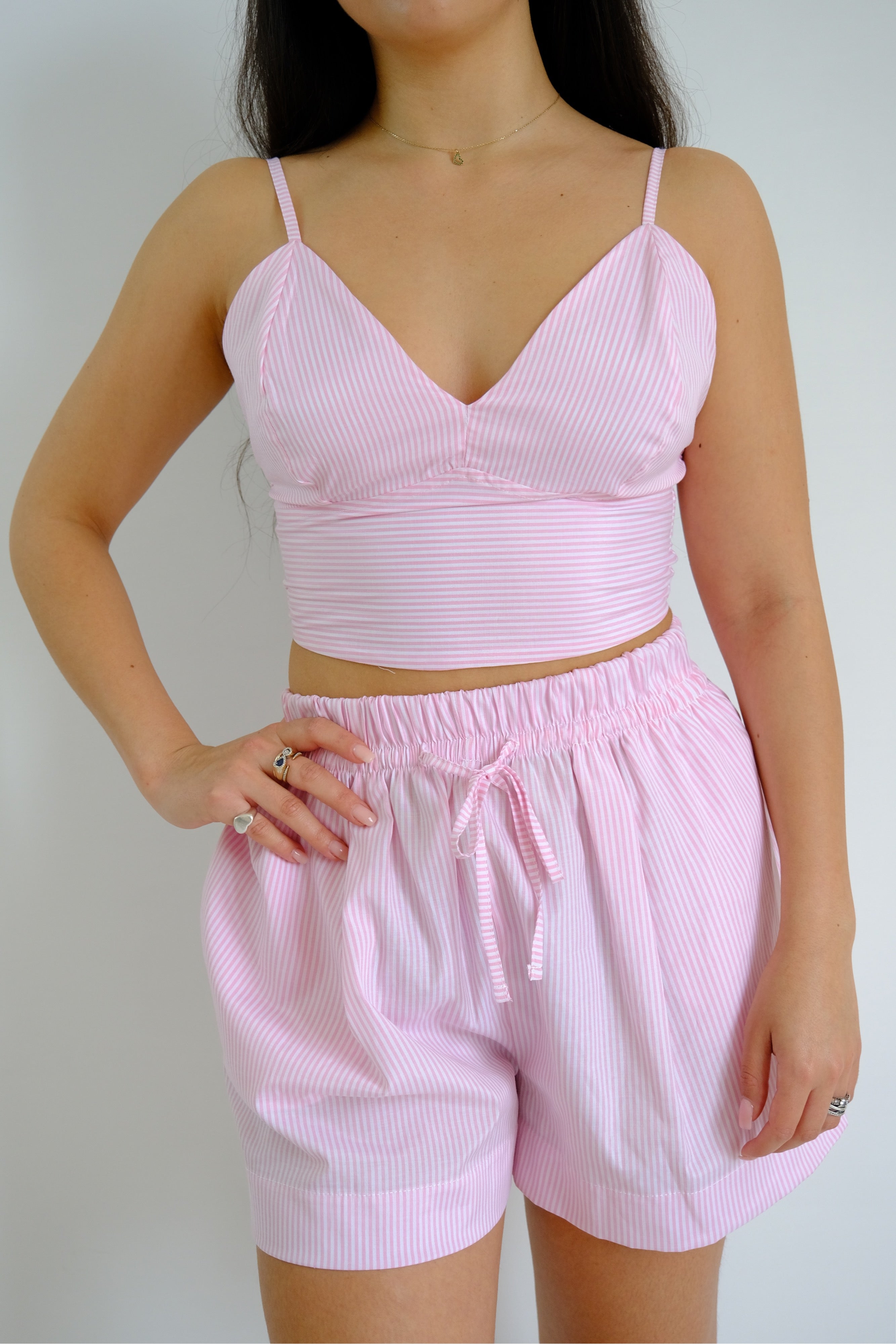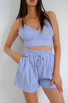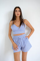 Il completo è composto da un top corto e dei pantaloncini Il top è di colore bianco e blu e l'altra variante rosa e bianco a righe, con una scollatura a V che mette in risalto il décolleté. I pantaloncini hanno una vita alta con una fascia elastica, che conferisce comfort e una vestibilità rilassata. Presentano anche un cordoncino per una regolazione personalizzata. Il tessuto leggero e adatto per le giornate estive, mentre il design a righe aggiunge un tocco di freschezza e stile.