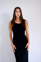 L'abito lungo nero è caratterizzato da un design elegante e minimalista. Ha spalline sottili e una scollatura profonda sul retro, che aggiunge un tocco di sensualità. La vestibilità è aderente nella parte superiore, mentre la gonna scende fluida fino a terra, creando un effetto slanciato e sofisticato. Il tessuto sembra morbido ed elasticizzato, garantendo comfort e libertà di movimento. Questo abito è perfetto per occasioni formali o eventi serali, offrendo un look classico e senza tempo.