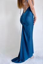 2. Abito Petrolio: Questo abito presenta un tono blu vibrante e un design simile, con spalline sottili e una parte superiore arricciata che aggiunge volume. Anche in questo caso, il taglio a sirena mette in risalto la silhouette, scendendo morbido fino a terra. La finitura lucida del tessuto dona un aspetto lussuoso e accattivante.