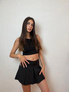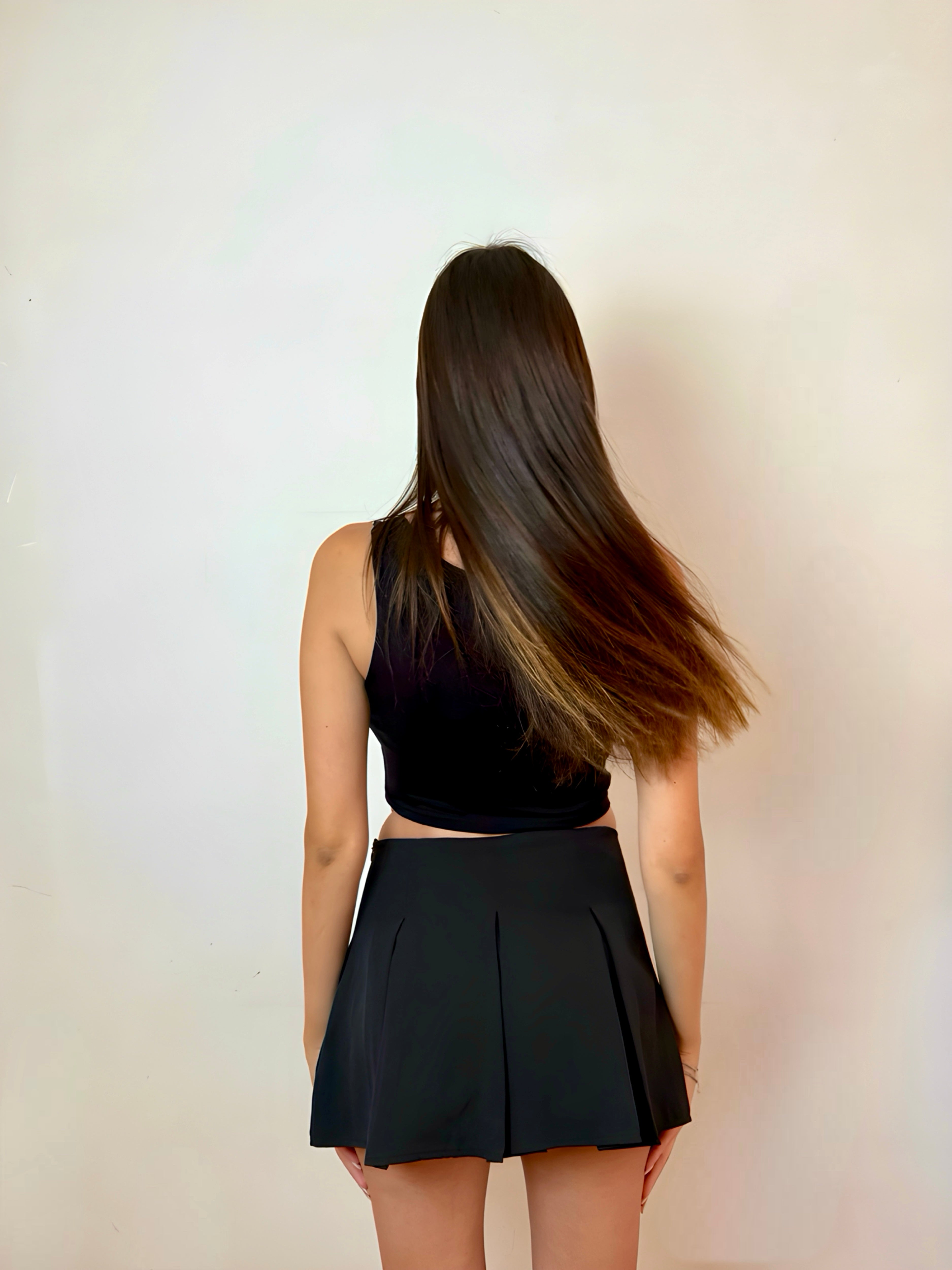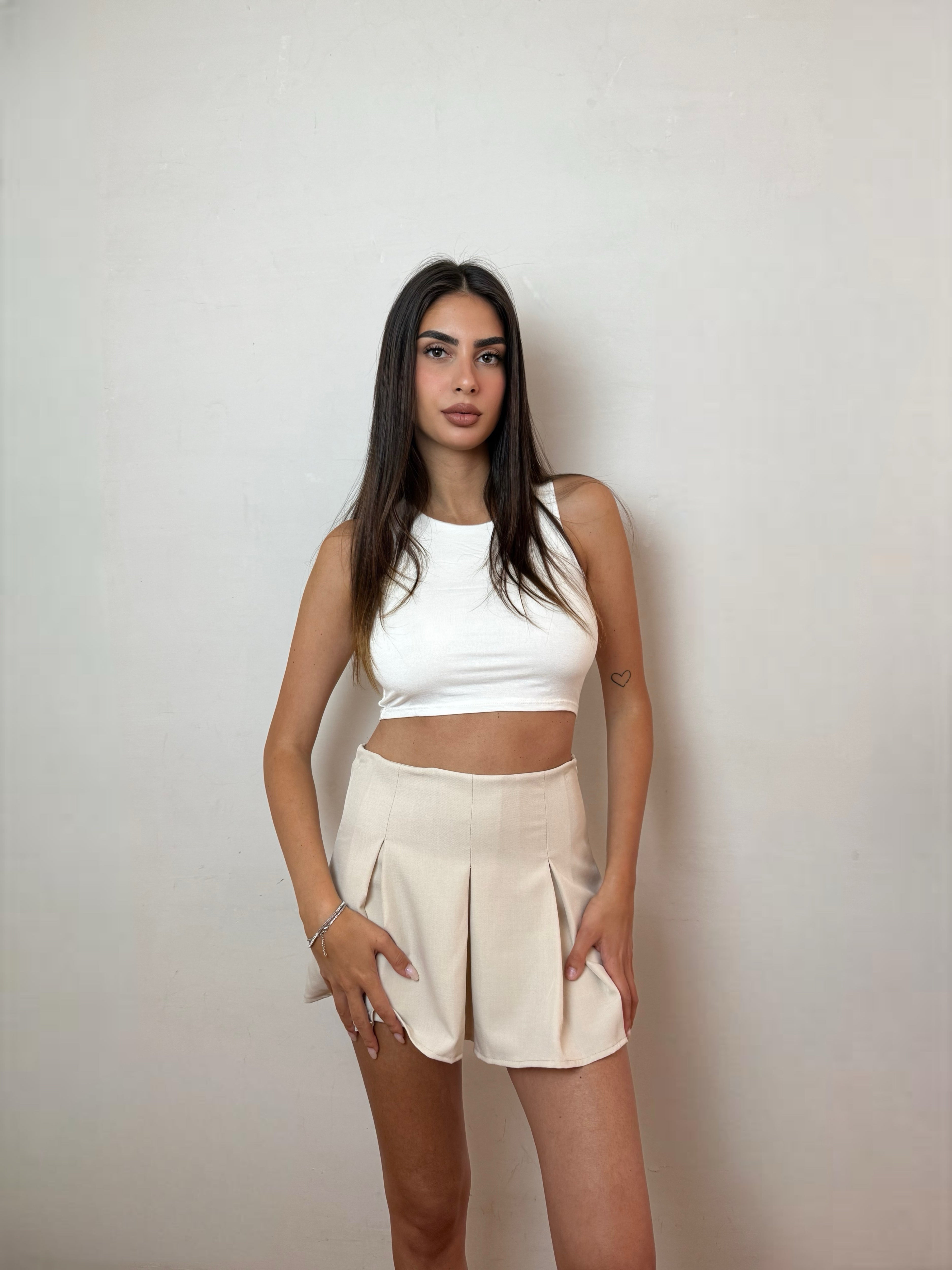 La gonna pantalone ha un design elegante e moderno, realizzata in un tessuto leggero di colore beige e nero. Presenta pieghe frontali che aggiungono movimento e struttura al capo. La lunghezza è corta, simile a un pantalone shorts, ma con l'aspetto di una gonna. Questo modello è versatile e può essere abbinato facilmente a top casual o più formali, ideale per diverse occasioni.