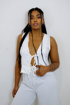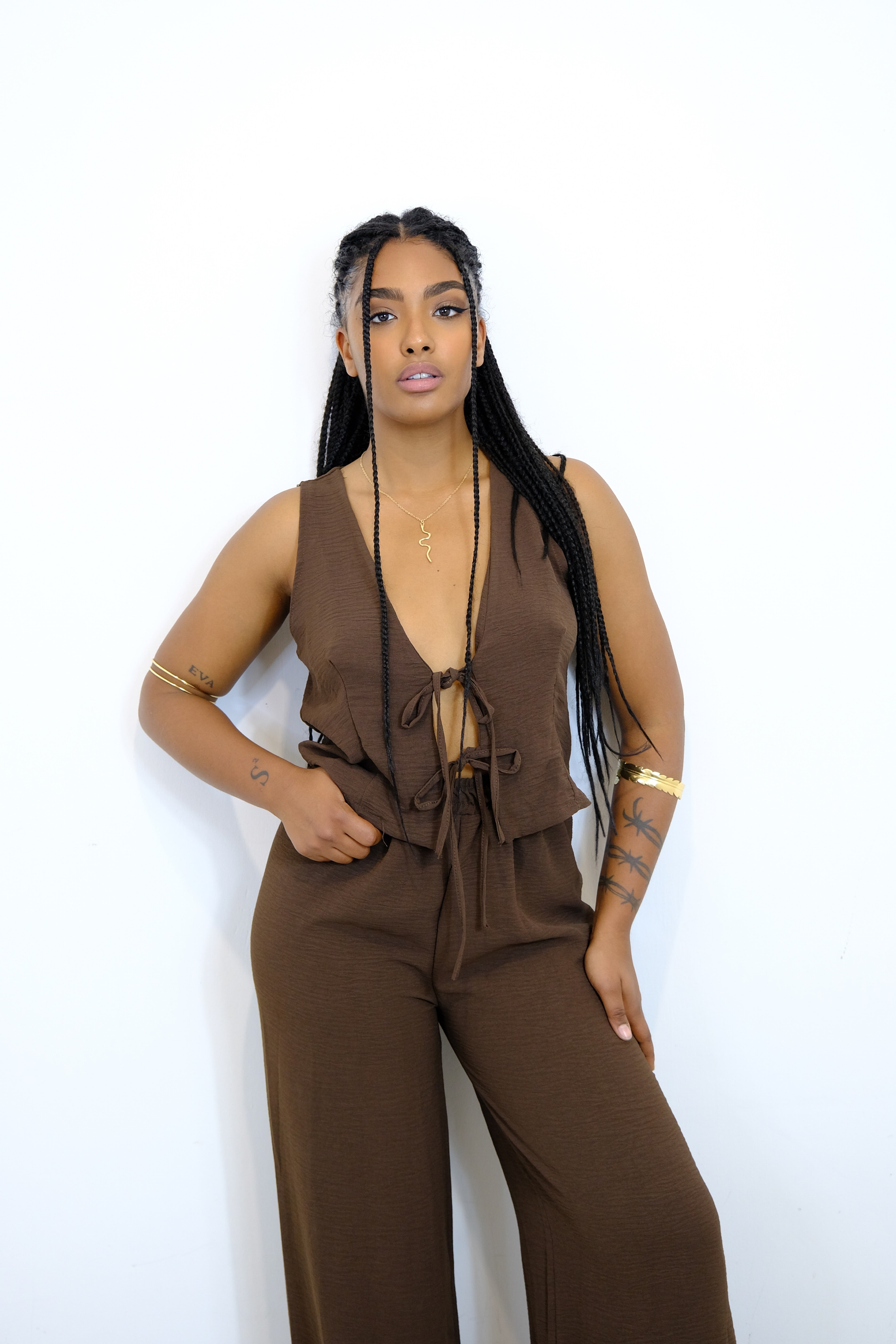 Il set è composto da un top con un design allacciato sul davanti e pantaloni larghi coordinati. Il top presenta un profondo scollo a V e un look fresco e casual, mentre i pantaloni offrono comfort e stile. Questo abbigliamento è perfetto per occasioni estive, unendo eleganza e praticità.