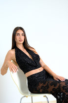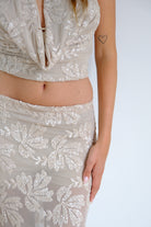 Coordinato composto da top e gonna in tessuto leggero color nude e nero con ricamo floreale tono su tono. Il top ha scollo profondo a drappeggio e spalline larghe, mentre la gonna lunga aderente valorizza la silhouette con un motivo floreale romantico e sofisticato. Il tessuto semi-trasparente con culotte conferisce leggerezza e freschezza, ideale per eventi speciali e serate eleganti.