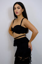 Il top è di forma bikini con spalline sottili e un design arricciato, che offre un look sensuale e giovanile. La gonna, lunga e con strati sovrapposti di pizzo, presenta un effetto a balze che aggiunge movimento e leggerezza al look. Questo abbigliamento è perfetto per occasioni estive, come eventi sulla spiaggia o feste all'aperto, grazie alla sua freschezza e alla tonalità vivace.