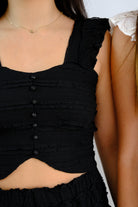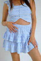 Il set è composto da un top corto e una gonna coordinata, entrambi di colore azzurro, bianco e nero. Il top presenta un design arricciato, con una scollatura che mette in evidenza la vita. La gonna è caratterizzata da un taglio a strati, con volant e dettagli arricciati che aggiungono movimento e volume. Il tessuto sembra leggero e traspirante, perfetto per le giornate estive. Questo set è ideale per un look fresco e femminile.